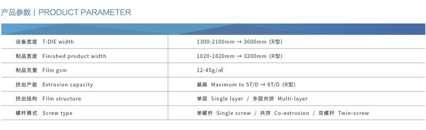 設備按制品結構所需可選擇單層/多層共擠工藝,還可裝備原料自動計量配料系統(tǒng),電暈系統(tǒng)、瑕疵檢測、在線測厚、全自動調節(jié)模具、二次打孔、在線分切、卸卷稱重、遠程維保系統(tǒng)等功能件。